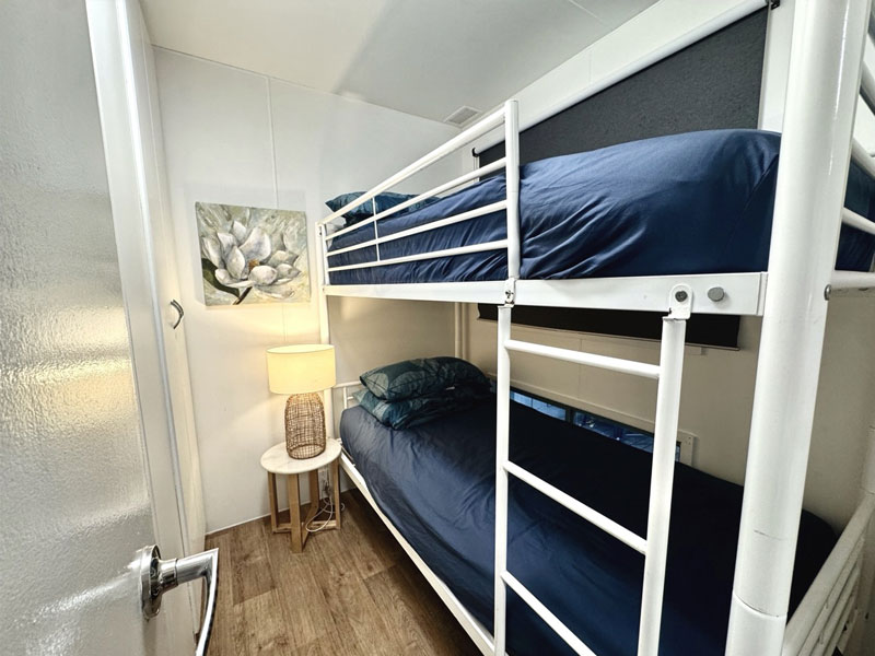 Sleeping up to four guests and featuring a double bed in the main living area and a separate bedroom with a bunk bed. The practical layout is designed for relaxed coastal stays, with an open-plan living and dining area that makes it easy to unwind together.